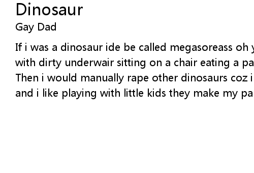 | Then i would manually rape other dinosaurs coz im a gay dinosaur named barney and i like playing with little kids they make my pants feel funny inside |
