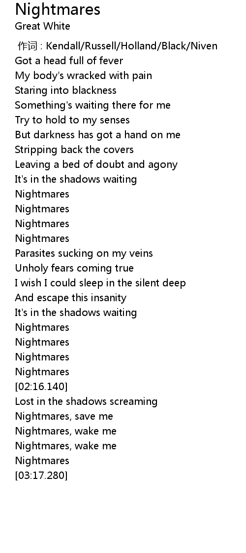 | [02:04.080] | Nightmares |