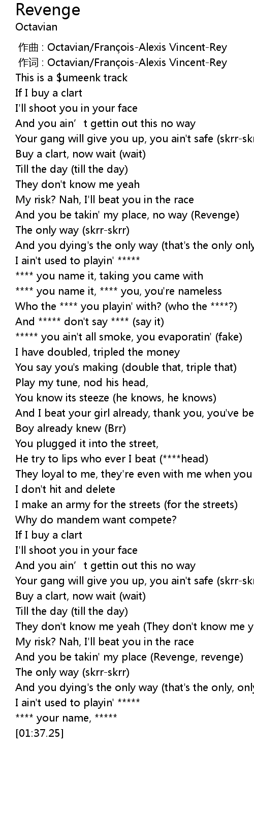 | [01:26.70] | And you be takin' my place (Revenge, revenge) |