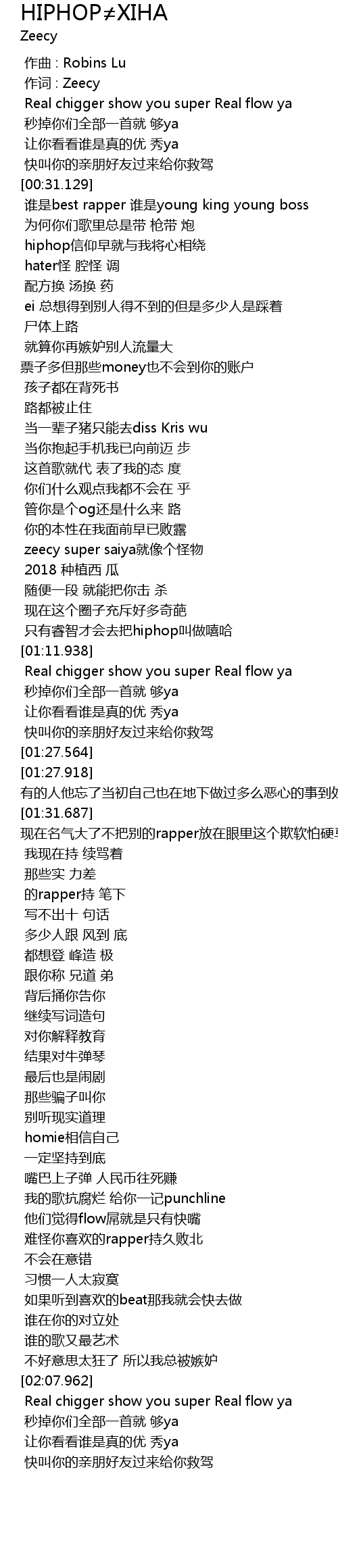 | [01:09.984] | zhǐ yǒu ruì zhì cái huì qù bǎ hiphop jiào zuò xī hā |