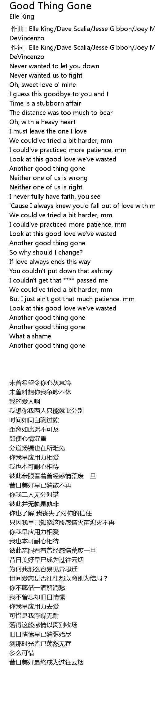 | [00:01.000] | zuò cí : Elle King Dave Scalia Jesse Gibbon Joey McClellan Paul DeVincenzo |