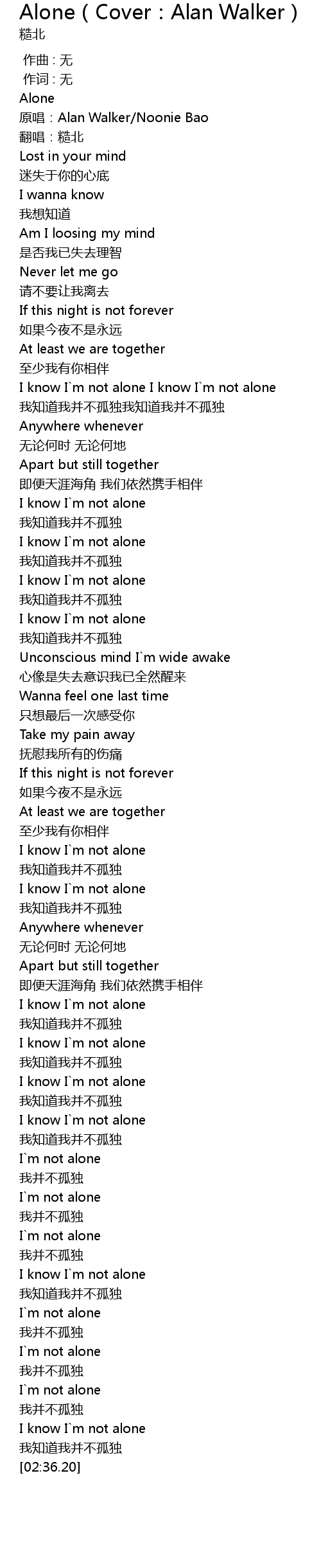 | [00:00.74] | 原唱:Alan Walker/Noonie Bao |