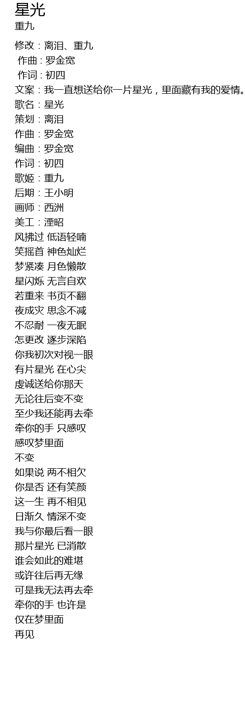 | [00:00.61] | 文案:我一直想送给你一片星光,里面藏有我的爱情。可是有一天,我的星光走到了尽头,只能目送你远去。 |