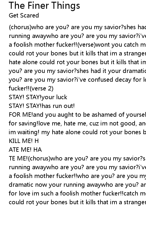 (chorus)who are you? are you my savior?shes had it your dramatic now your running awaywho are you? are you my savior?i've confused decay for love im such a foolish mother fucker!!(verse)wont you catch me? im waiting!my hate alone could rot your bones but it kills that im a strangercatch me! im waiting! my hate alone could rot your bones but it kills that im a stranger!(chorus)who are you? are you my savior?shes had it your dramatic now your running awaywho are you? are you my savior?i've confused decay for love im such a foolish mother fucker!!(verse 2) |