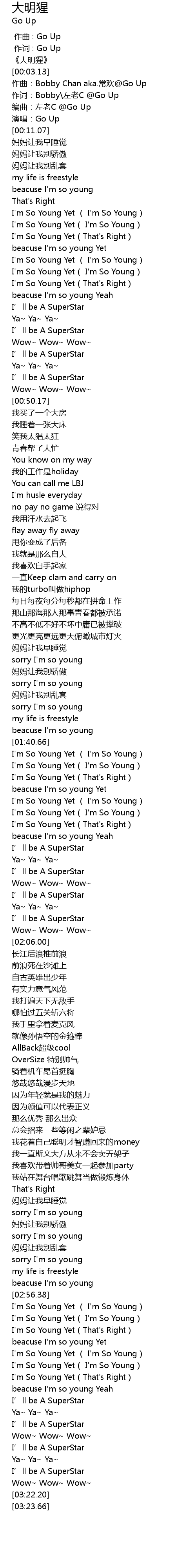 | [00:06.37] | 作词:Bobby\左老C @Go Up |