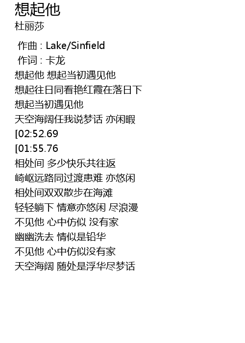 | [03:01.51][02:52.69][01:48.16][01:39.93][00:44.89][00:36.87] | ~~~想起他 |
