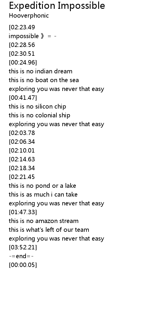 | [03:05.61][02:23.49][01:17.52][00:10.53] | hooverphonic expedition impossible |