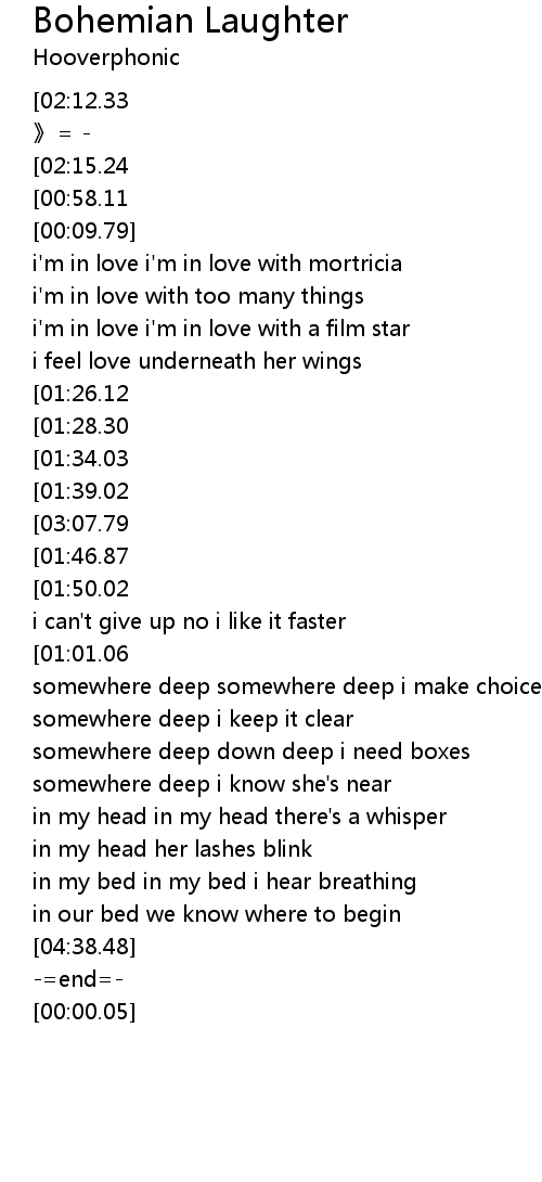 | [03:20.91][02:12.33][00:00.00] | hooverphonic bohemian laughter |
