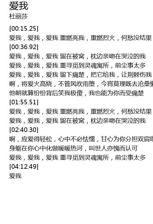 | [00:20.18] | 爱我,爱我,爱我 重燃亮我,重燃烈火,何愁没结果 |