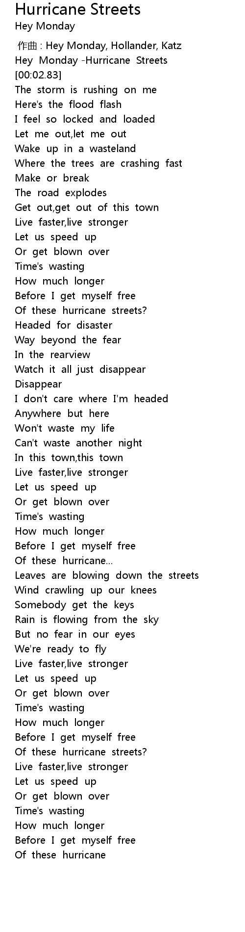 | [00:01.47] | Hey Monday Hurricane Streets |