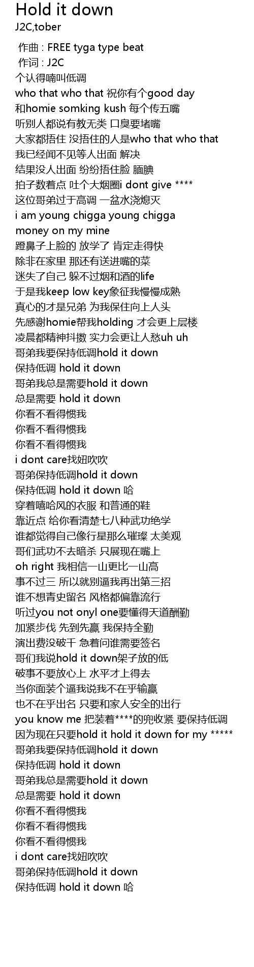 | [01:08.88] | 哥弟我总是需要hold it down |