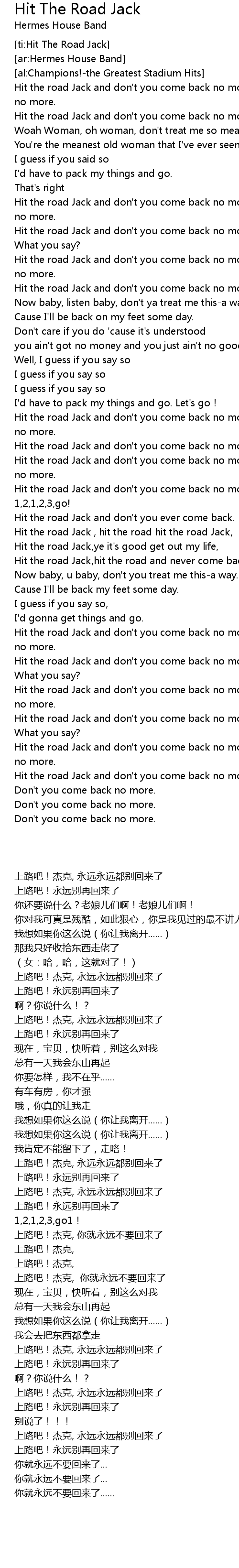 | [01:44.49] | Hit the road Jack and don't you ever come back. |