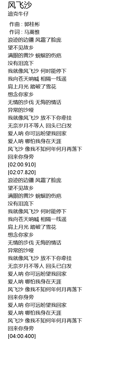 | [03:47.380] | 风飞沙 像我不知何年何月再落下 |