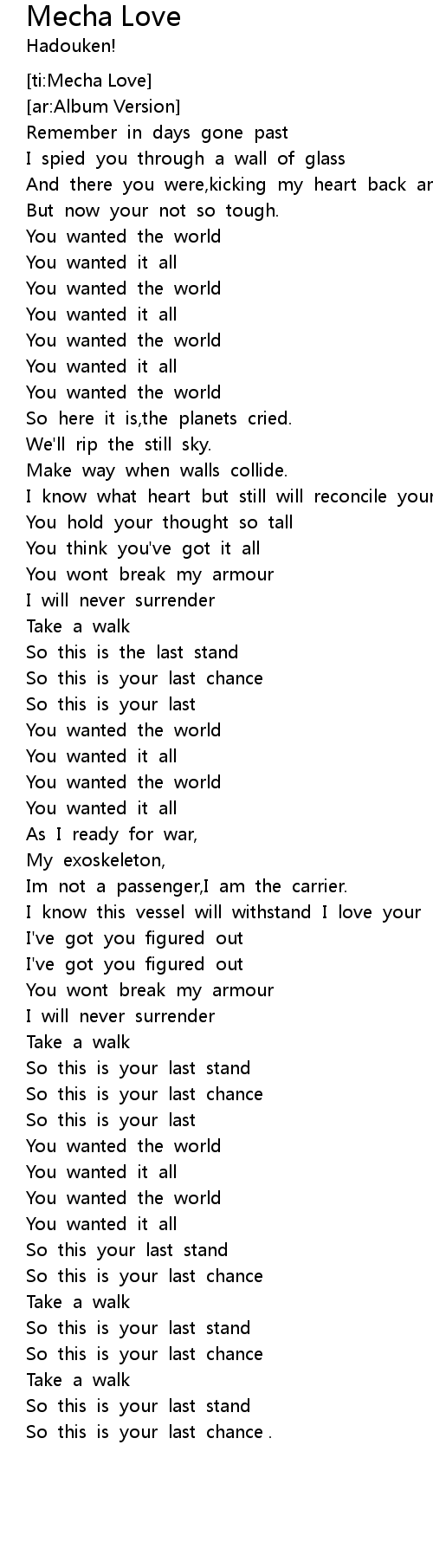 | [02:39.543] | I know this vessel will withstand I love your mecha love |