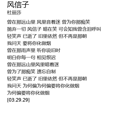 | [00:22.98] | 曾在那远山里 风里音着迷 曾为你那痴笑 |