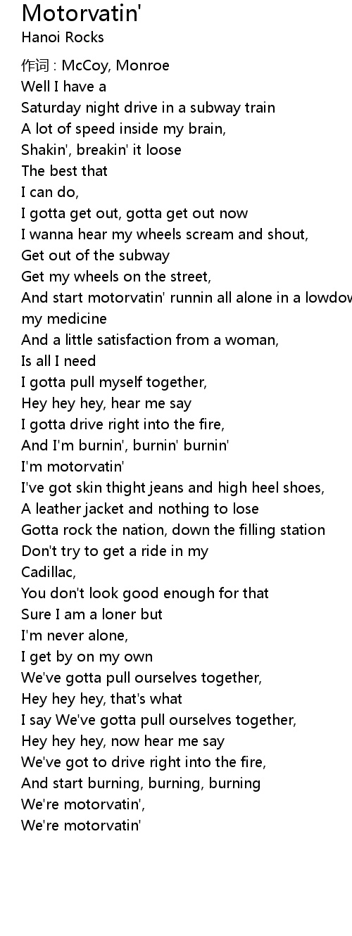 | And start motorvatin' runnin all alone in a lowdown street, just a searching for my medicine | |