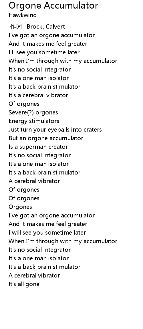 | [00:15.92] | I' ve got an orgone accumulator |