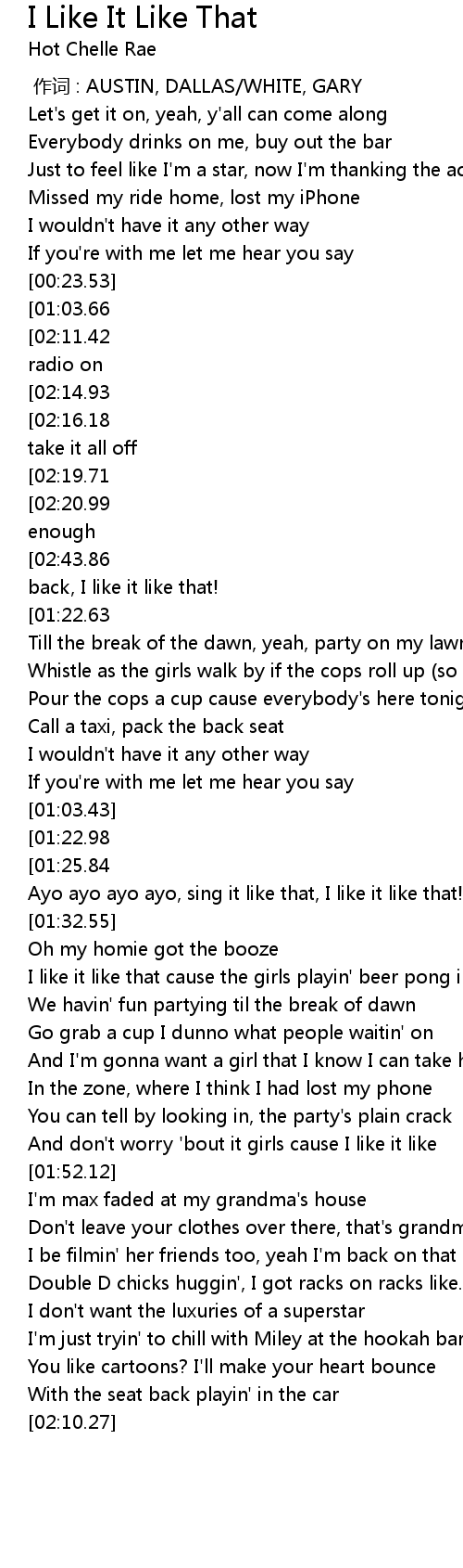 | [02:38.82][02:19.71][01:12.61][00:33.02] | I like it like that! |