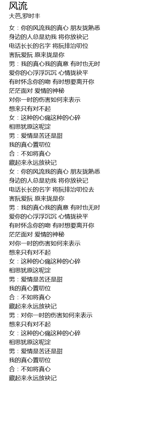 | [01:59.59] | 女:你的风流我的真心 朋友拢熟悉 |