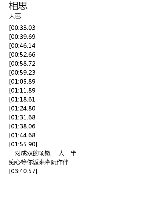 | [03:02.44][01:31.68] | 思念你 阮伤心的珠泪滴 |