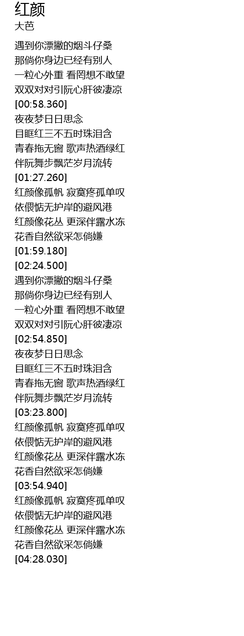 | [04:11.410] | hong yan xiang hua cong geng shen ban lu shui dong |
