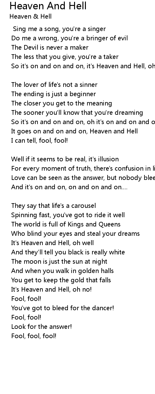 So it's on and on and on, it's Heaven and Hell, oh well |