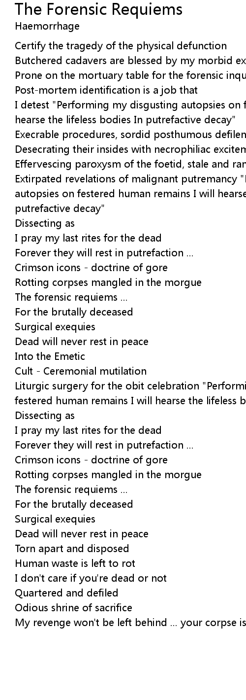 Liturgic surgery for the obit celebration "Performing my disgusting autopsies on festered human remains I will hearse the lifeless bodies In putrefactive decay" |