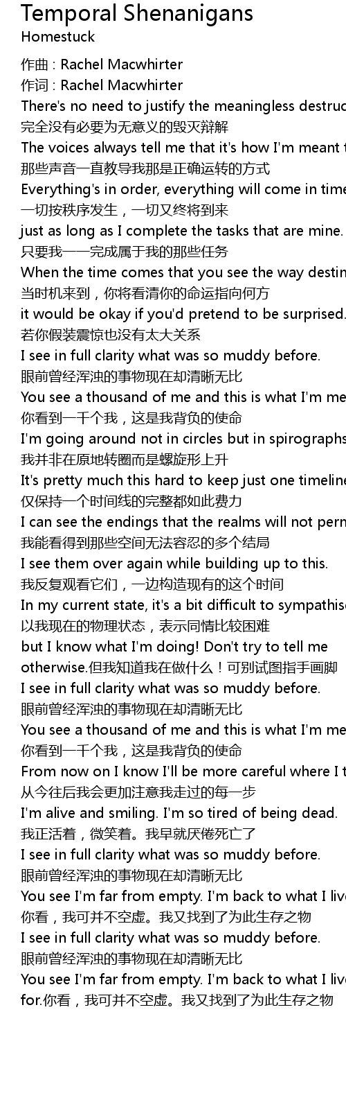 | [02:16.11] | I can see the endings that the realms will not permit. wǒ néng kàn de dào nèi xiē kōng jiān wú fǎ róng rěn de duō gè jié jú |