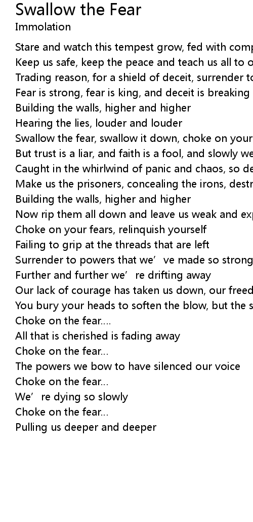 | Swallow the fear, swallow it down, choke on your trust and all' s well | |
