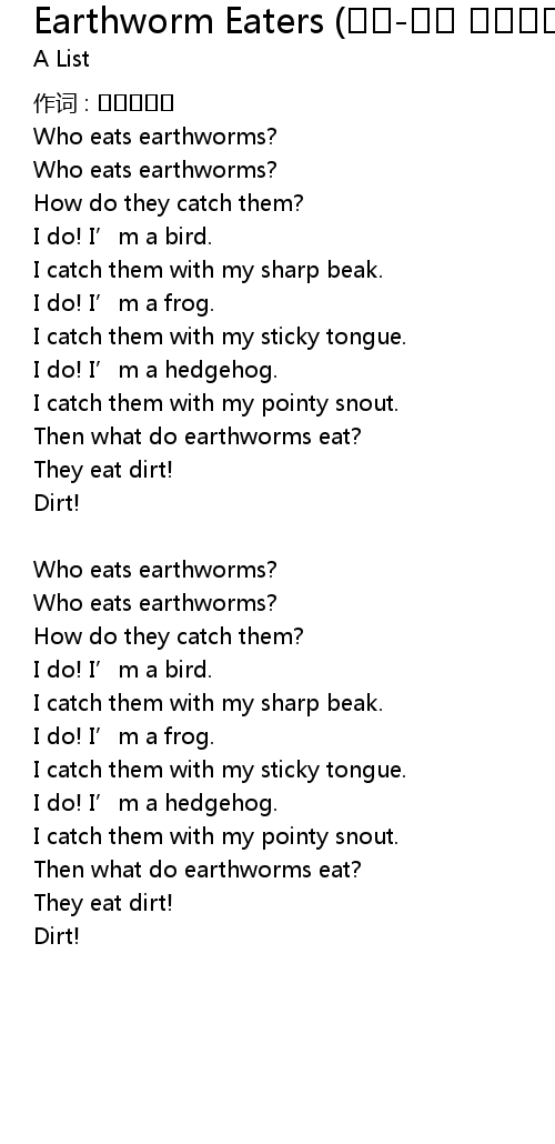 | Song | Earthworm Eaters (챈트-누가 지렁이를 먹을까?) |