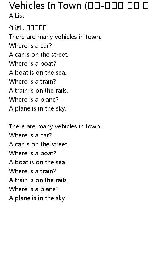 | Song | Vehicles In Town (챈트-다양한 교통 수단) |