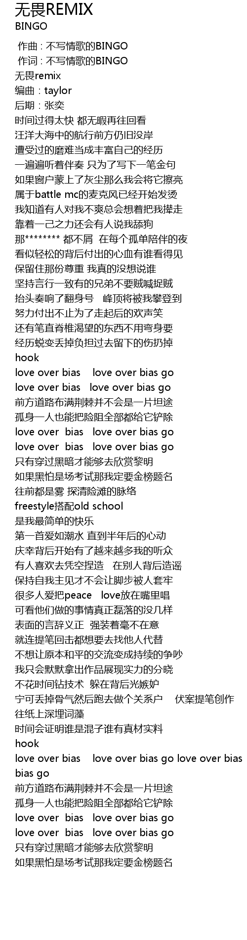 | [02:35.689] | love over bias love over bias go 只有穿过黑暗才能够去欣赏黎明 如果黑怕是场考试那我定要金榜题名 |