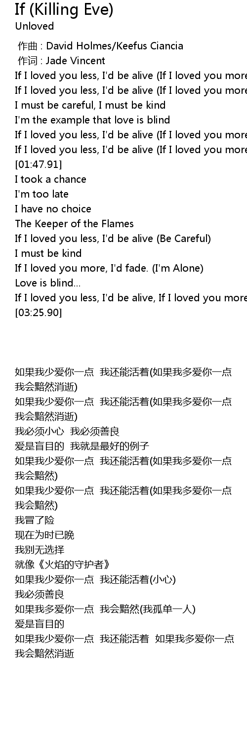 | [00:37.63] | If I loved you less, I' d be alive If I loved you more, I' d fade away |