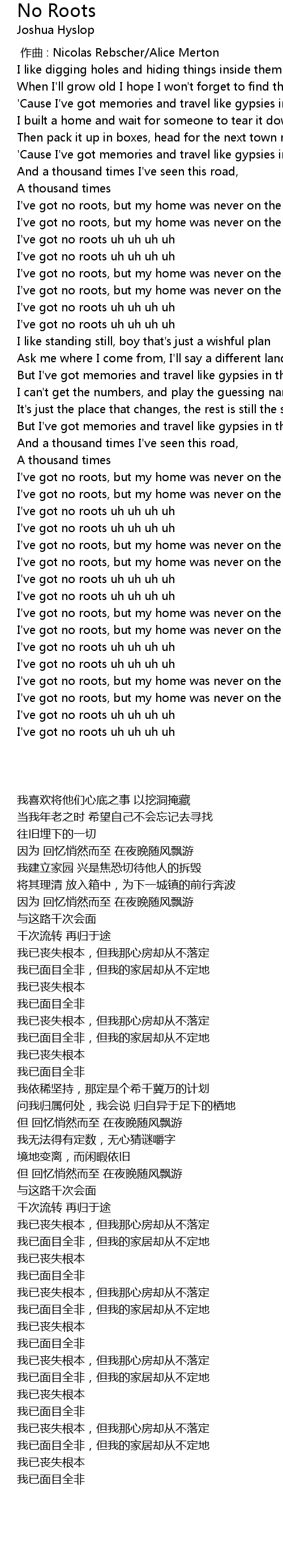 | [03:29.330] | I' ve got no roots uh uh uh uh |