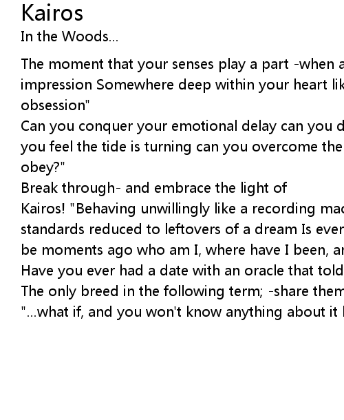 Kairos! "Behaving unwillingly like a recording machine All these emotional standards reduced to leftovers of a dream Is everything just like it seemed to be moments ago who am I, where have I been, and how will I know?" |