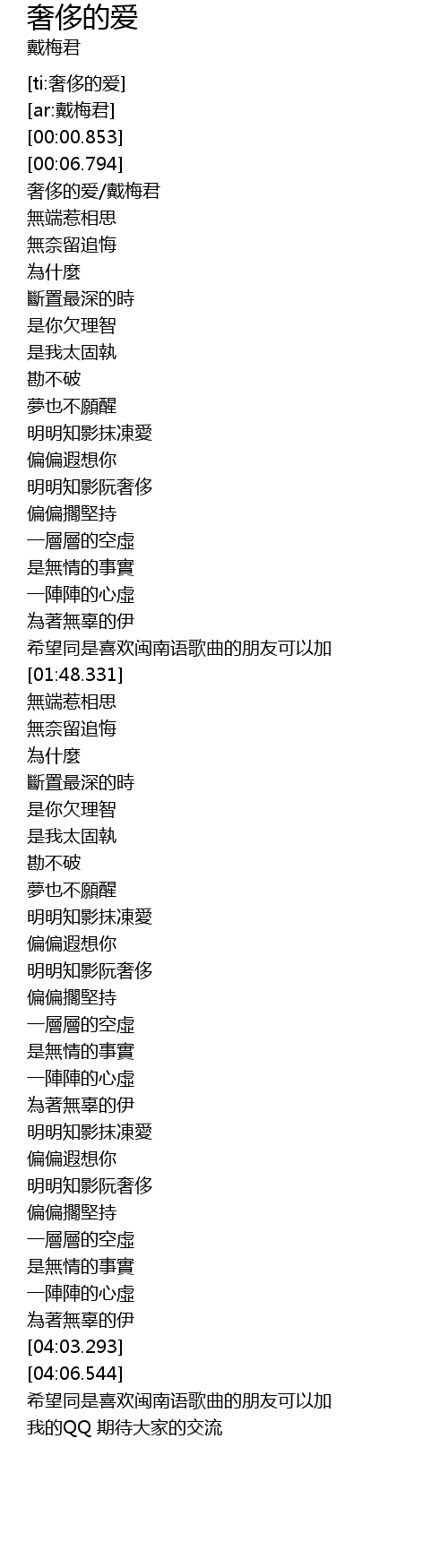 | [00:15.105] | 奢侈的爱/戴梅君 |