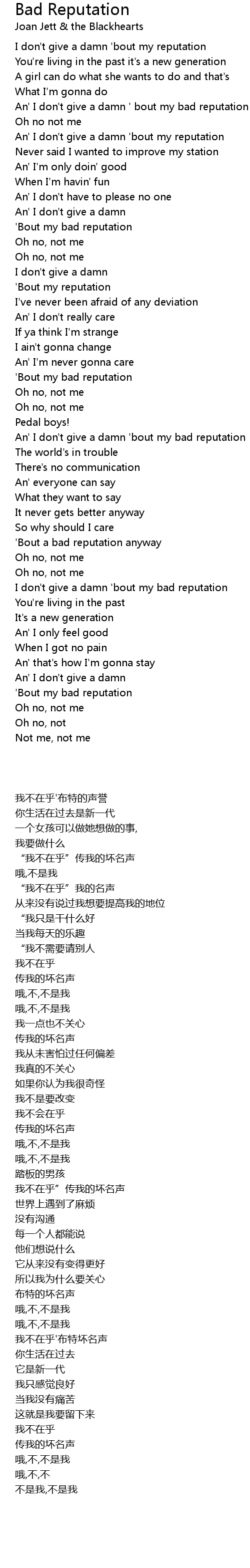 An' I don't give a damn ' bout my bad reputation |