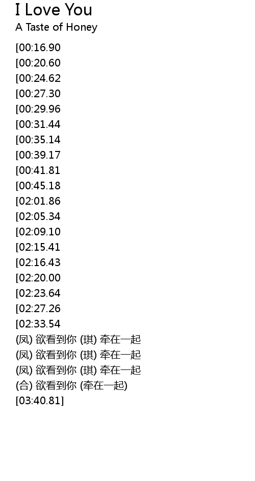 | [03:17.05] | (凤) 欲看到你 (琪) 牵在一起 |