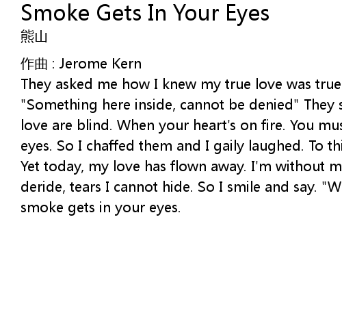 | They asked me how I knew my true love was true? Oh, I of course replied. " Something here inside, cannot be denied" They said someday you' ll find, all who love are blind. When your heart' s on fire. You must realize smoke gets in your eyes. So I chaffed them and I gaily laughed. To think they could doubt my love. Yet today, my love has flown away. I' m without my love. Now laughing friends deride, tears I cannot hide. So I smile and say. " When a lovely flame dies, smoke gets in your eyes. |
