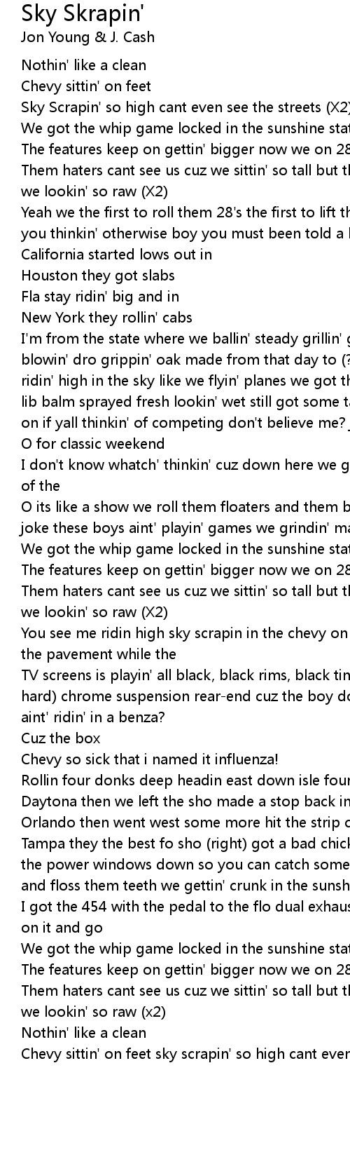 I'm from the state where we ballin' steady grillin' golds hanin' out the window blowin' dro grippin' oak made from that day to (?????) to my county mane we ridin' high in the sky like we flyin' planes we got them paint jobs glossy like lib balm sprayed fresh lookin' wet still got some tape on better get your grind on if yall thinkin' of competing don't believe me? just come to the |