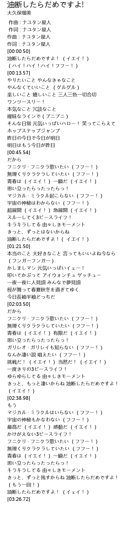 | [03:23.29] | 油断したらだめですよ! (イェイ!) |