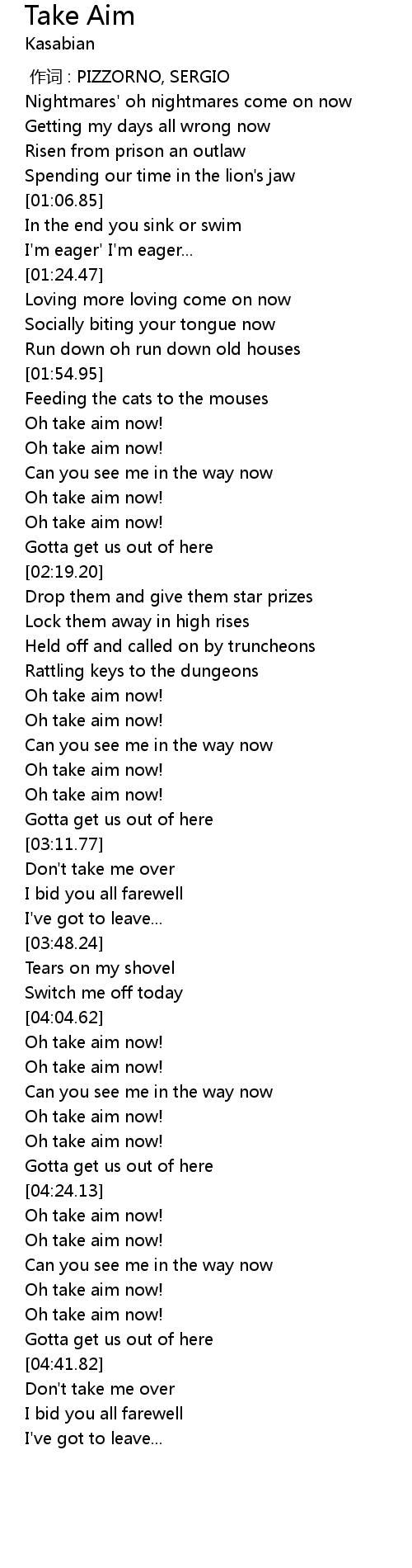 | [02:00.01] | Oh take aim now! |