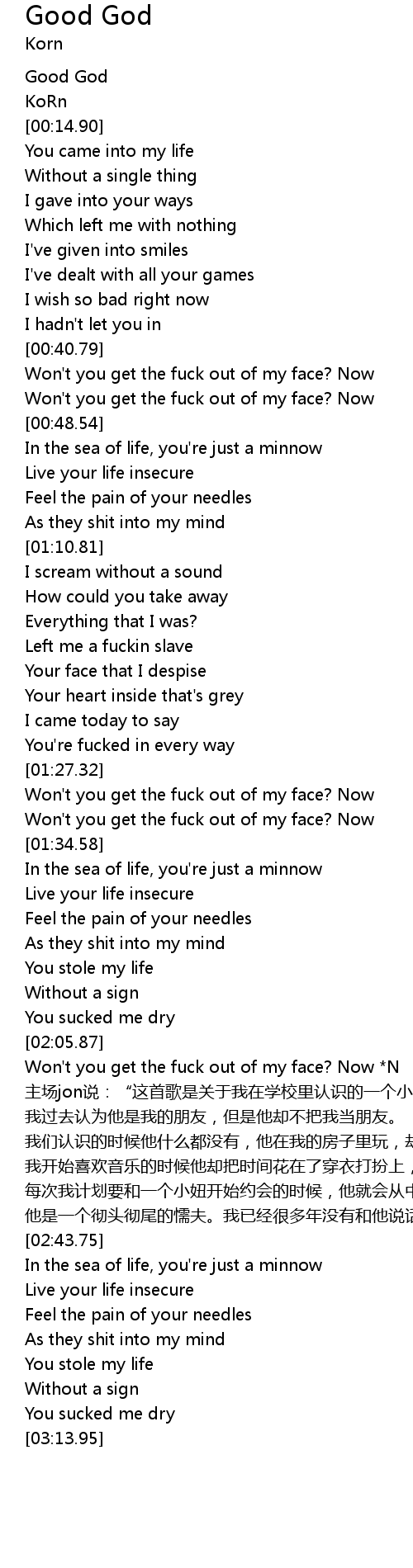 | [00:41.06] | Won' t you get the fuck out of my face? Now |