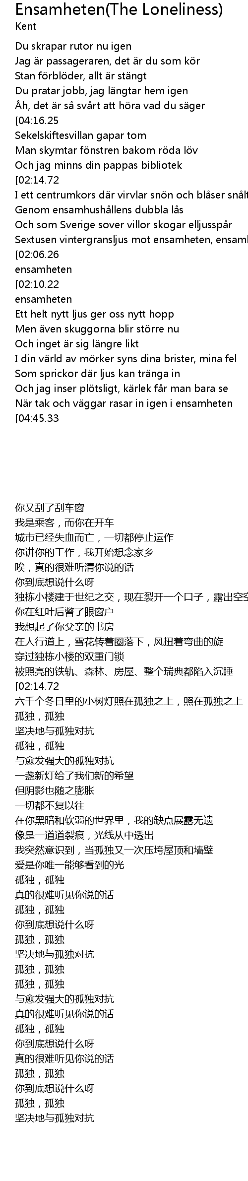 | [01:58.86][02:06.26][04:04.32][04:12.05][04:19.33][04:26.39][04:34.04][04:49.54][04:57.14][05:04.62][05:12.13] | Ensamheten, ensamheten |