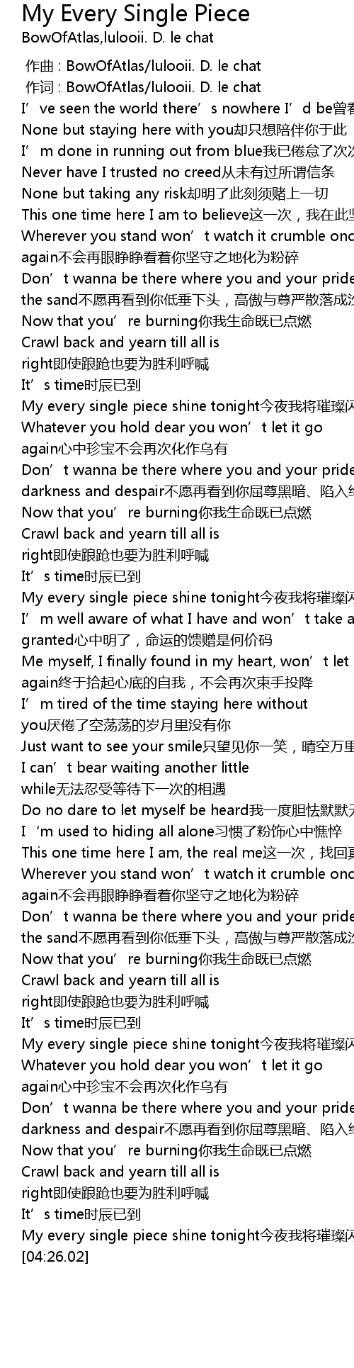 | [03:38.66] | My every single piece shine tonight今夜我将璀璨闪耀 |