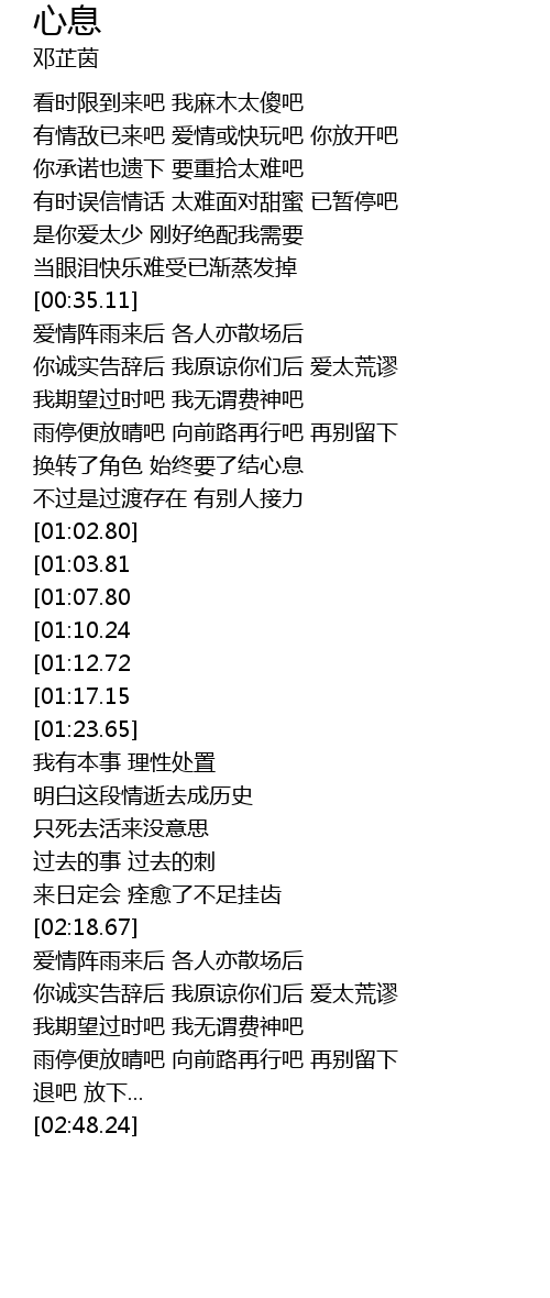 | [02:30.68] | 雨停便放晴吧 向前路再行吧 再别留下 |
