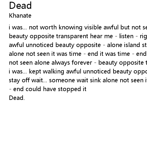 i was... not worth knowing visible awful but not seen alone always forever - beauty opposite transparent hear me - listen - right here i was... kept walking awful unnoticed beauty opposite - alone island stay off wait... someone sink alone not seen it was time - end it was time - end i was... visible awful but not seen alone always forever - beauty opposite transparent see me - right here i was... kept walking awful unnoticed beauty opposite deserted - alone island stay off wait... someone wait sink alone not seen it was time - end it was time - end could have stopped it |