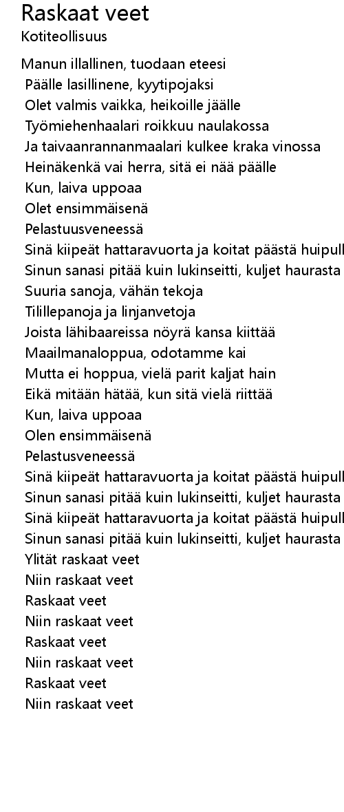 | Sinun sanasi pitää kuin lukinseitti, kuljet haurasta kuunsiltaa | |
