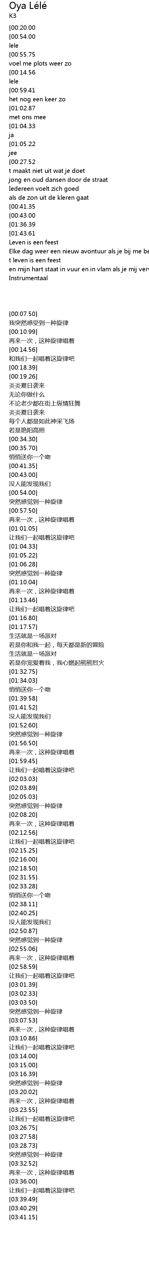 | [00:16.92][01:02.87][01:15.21][02:01.46][02:13.59][02:59.87][03:12.51][03:25.31][03:37.70] | Zing met ons mee |
