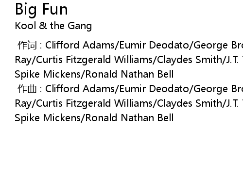 | [00:00.000] | zuò qǔ : Clifford Adams Eumir Deodato George Brown Michael Ray Curtis Fitzgerald Williams Claydes Smith J. T. Taylor Robert Bell Robert Spike Mickens Ronald Nathan Bell |